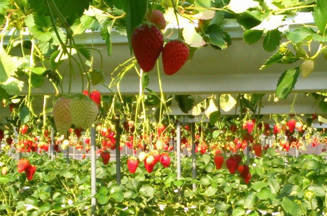 「高設栽培」でいちご狩りが楽しめます。いちごに練乳を沢山かけるのが大好きな方に朗報!練乳持込もOKですよ!