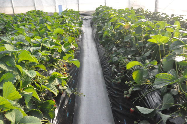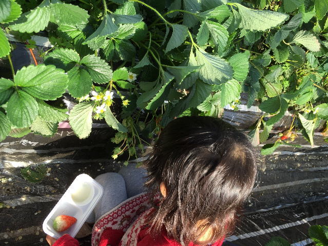 「スカイベリー」は、しゃがんで(土耕栽培)食べ、「とちおとめ」は、立ったまま(高設栽培)食べられます。従来型の土耕栽培は土の中を歩いていき、かがんで摘むので大人にとってはちょっと疲れる体制ですが、地面近くに這っているいちごは子供も手に取り易いのです。高設栽培は整備されていてあまり土!農園!と言う感じのしない綺麗に管理された環境ですが、通路なども歩き易くなっており摘みやすいです。