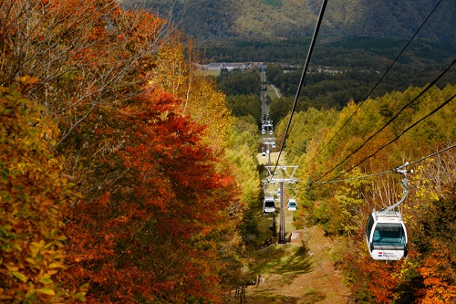 紅葉の間をゴンドラで登り、山頂からの景色は見渡す限り赤・黄色に染まり