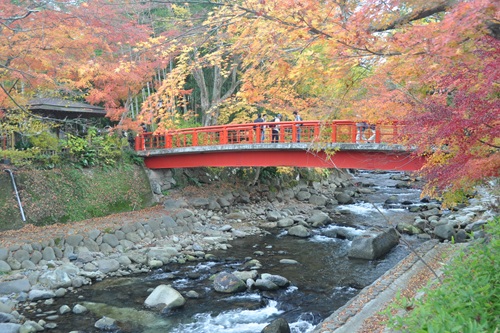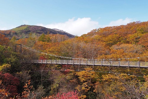 ツツジの名所として知られる八幡ツツジ園地の近くにあり、橋の上からは那須連山の美しい紅葉を眺めることができます!