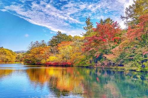 池の水面には色鮮やかな紅葉の姿が映り込みまるで絵画のような景色が
