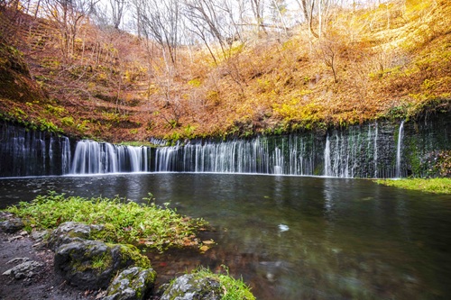 白糸の滝は、名前の通り白い糸のように水が流れ落ちる美しい滝で軽井沢を象徴する紅葉スポットの一つです。
