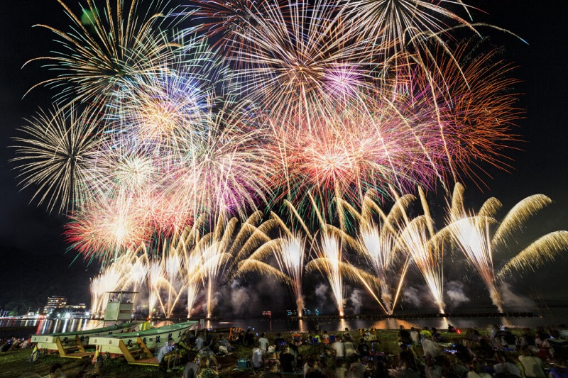 高さ250m・幅500mという壮大なスケールで夜空を彩り、音と光の競演が感動を呼びます。