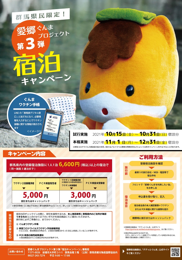 ・①群馬県民、②ワクチン接種済者もしくはPCR検査陰性者の①と②をともに満たす方は5,000円割引の対象