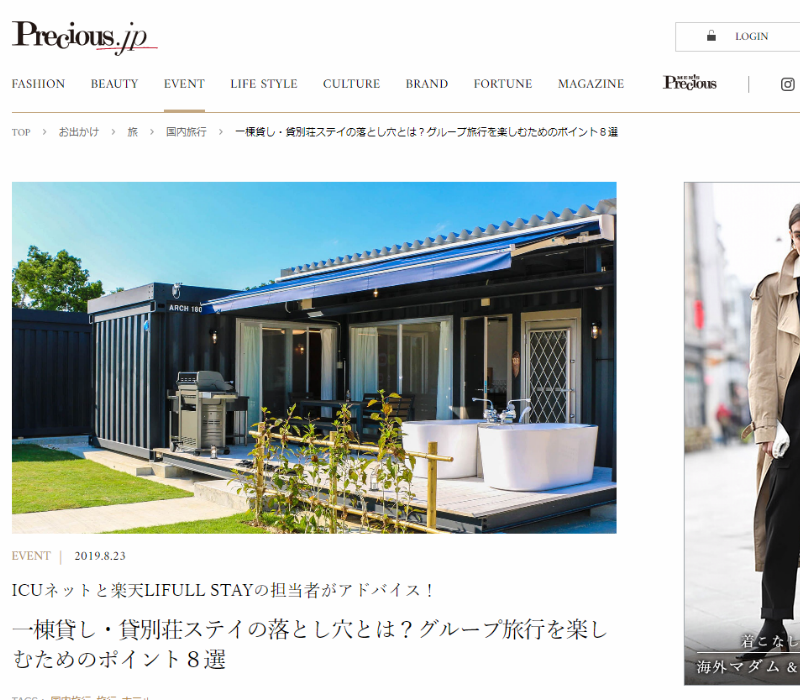 この度、小学館発行の雑誌「プレシャス・Precious」のWEBサイト内の「一棟貸し・貸別荘ステイの落とし穴!ここを押さえて宿泊を充実させよう」という企画で、当社担当によるアドバイス記事が掲載されました!
