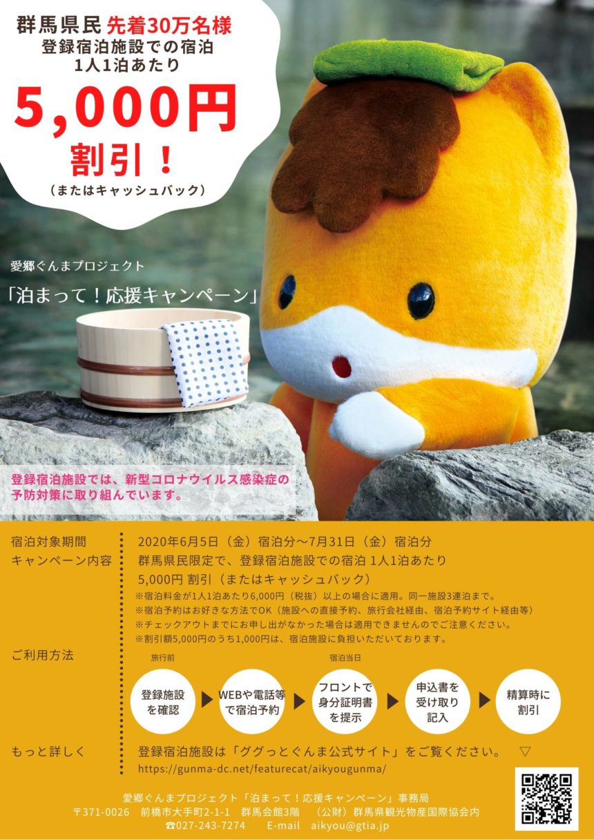 宿泊当日、身分証明書(運転免許証・保険証・マイナンバーカード等)により群馬県民であることが確認できた宿泊客に対して、割引(またはキャッシュバック)を適用します。