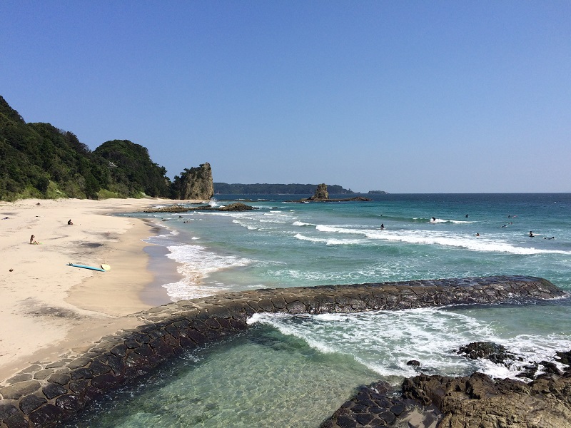 サーフィンなどにも向いている大きな波が来るビーチ。年間通して使える温水シャワーもあり。下田市のビーチに共通している透明な水と白い砂浜はここでも!!サーフィンショップではお子さまのサーフィンデビューもできますよ。