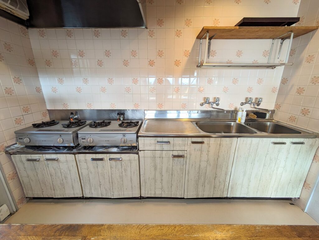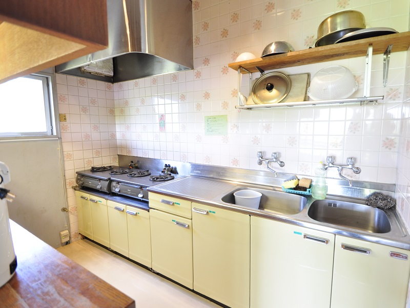 キッチンはガスコンロが4口あり。大人数での調理・自炊にも向いています。皆でカレーを作ったり鉄板料理も定番ですね。