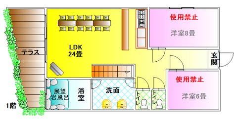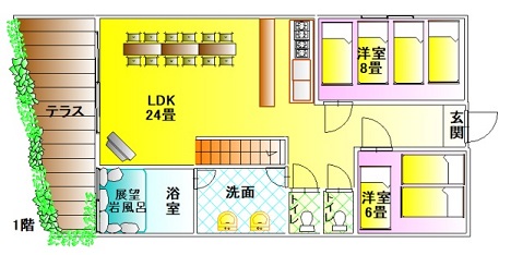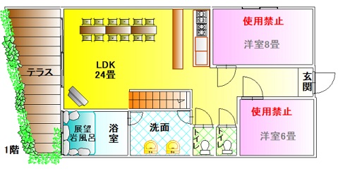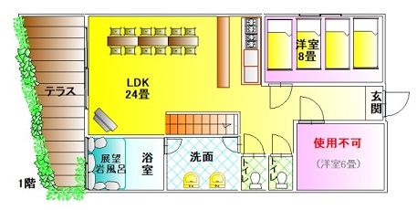 通常10名以上でご利用いただいている建物を8名様でもご利用いただけるように設定しております。リビングが24畳ございますので少ない人数ですと広々と、最大15名様でご利用頂いても窮屈を感じることなく、ご旅行を楽しむことが可能です。