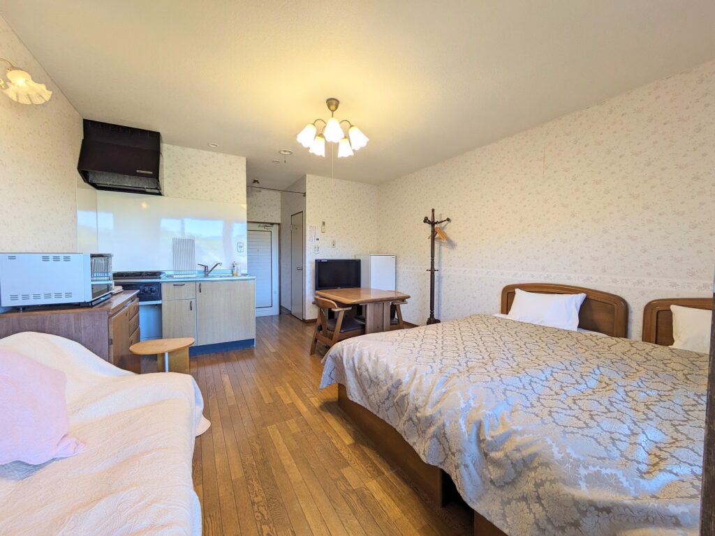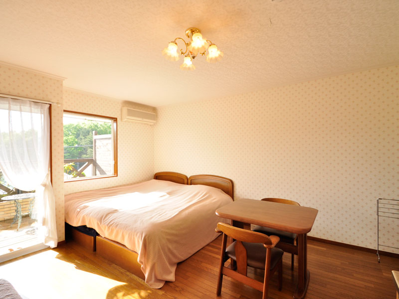 冷蔵庫やキッチンも完備の為、湯治も兼ねて長期滞在する方も多い客室です。東向きの明るいお部屋なので、朝は小鳥のさえずりと朝日で目覚める事ができます。夜はテラス越しに星のまたたきを見ることができ、自然を堪能できます。