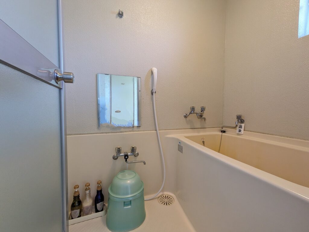 室内の内風呂も蛇口をひねると温泉が出てきます。室内と露天風呂、両方行ったり来たりしながら温泉浴ができます。24時間いつでも貸切で利用できる露天風呂はとても贅沢。温度調整は手元でできますので、お好みの温度で温泉浴ができるのもうれしいですね。