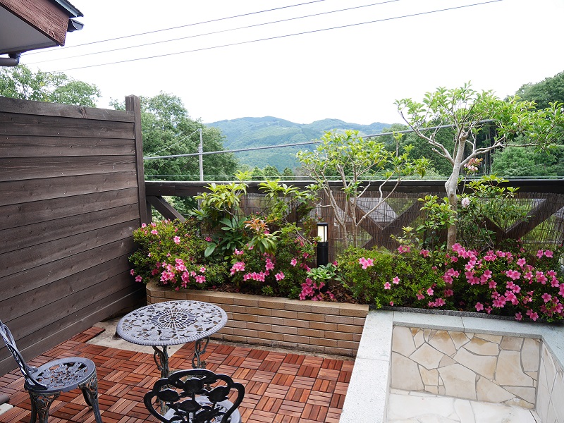 テラスにはテーブル・椅子付き。露天風呂も備わっています。