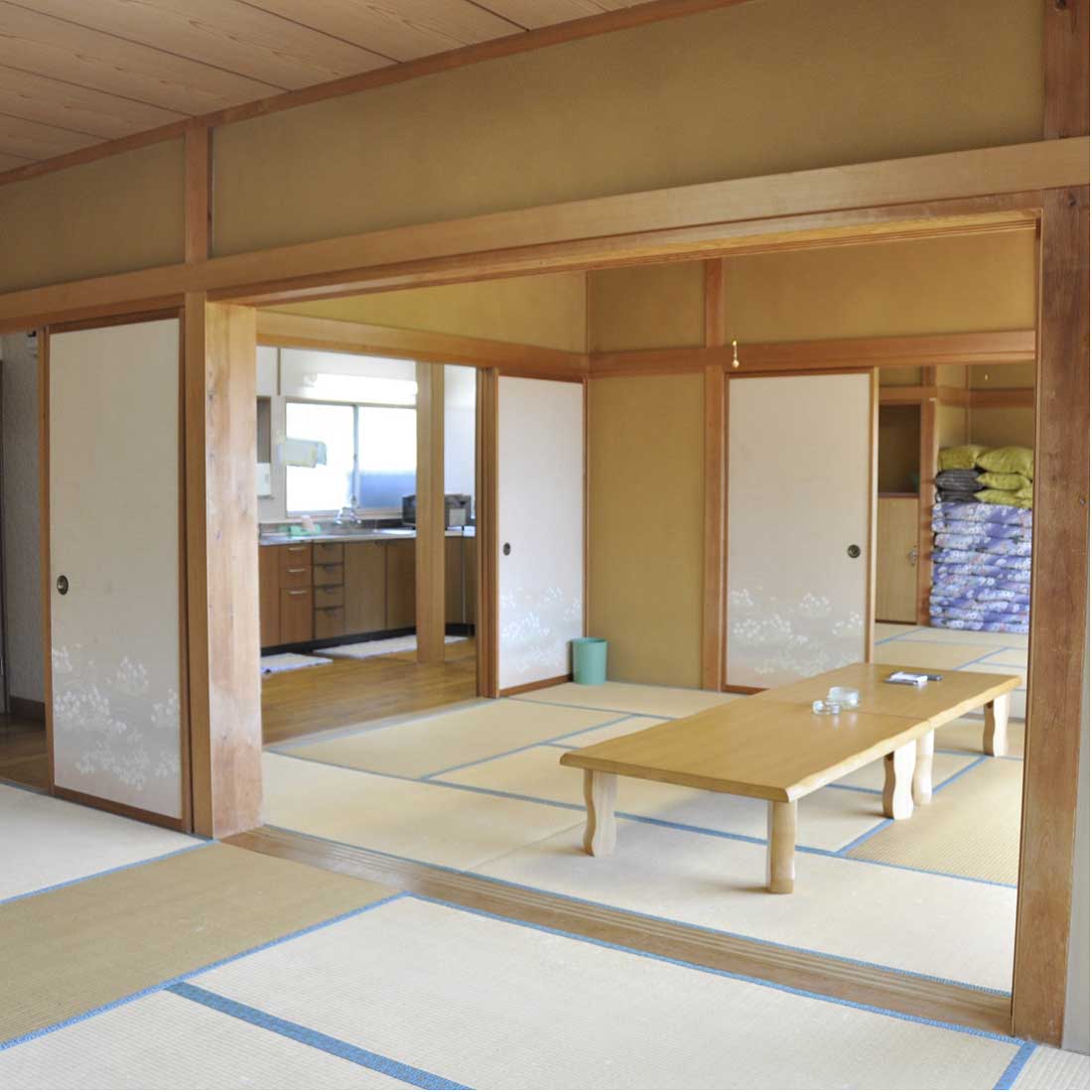 室内は和室基調で畳のお部屋に布団を敷くスタイル。海辺のおばあのうちに来たような気楽な雰囲気で、お子さんから学生さん、グループの方などにも好評です。