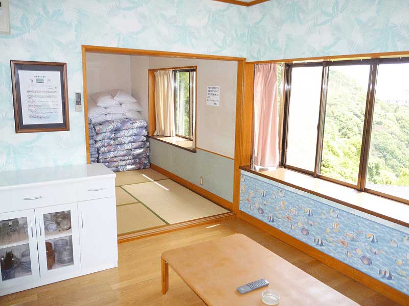 室内は和室基調で畳のお部屋に布団を敷くスタイル。海辺のおばあのうちに来たような気楽な雰囲気で、お子さんから学生さん、グループの方などにも好評です。