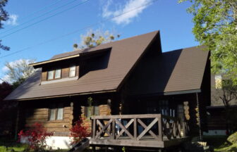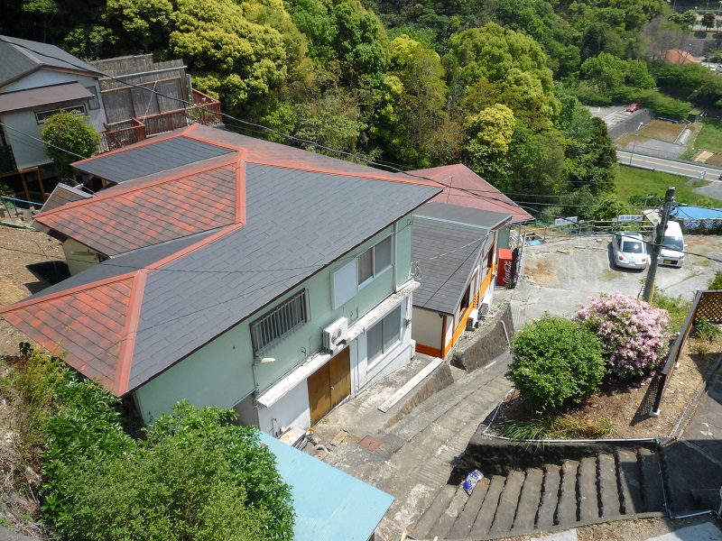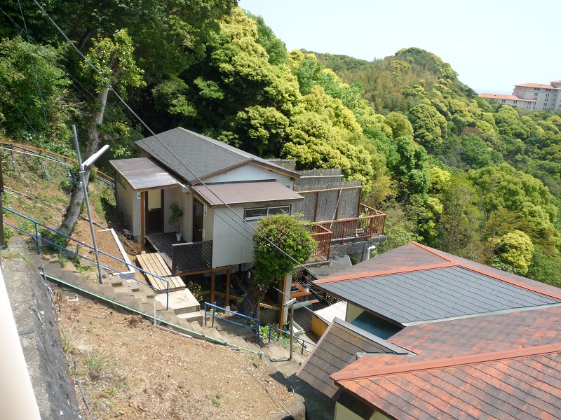 別荘地の比較的下の方に立地している建物です。写真左手の一番大きな建物、駐車場から階段のぼって2棟目です。