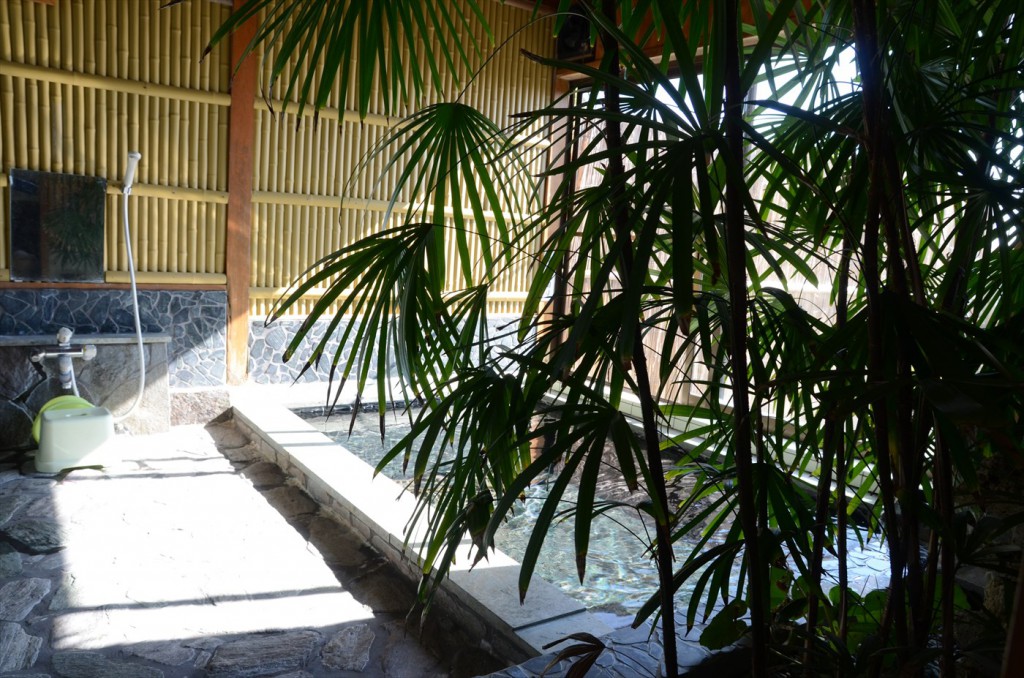 和風の展望風呂。地元産・伊豆石を使った造りのお風呂です。カランは5か所あり。例年は共同の展望風呂でしたが、2022年度も引き続き、新型コロナ感染症対策により、この広いお風呂がこちらのコテージ宿泊者さま専用貸切でご利用いただけます!