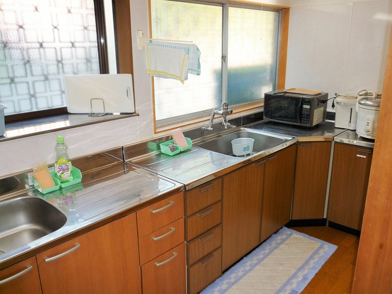 和室は全3部屋あり。ふすまを開けると全てのお部屋がつながり大広間としてご利用いただけます。キッチンには大型冷蔵庫とガスコンロは3口完備。大勢での自炊やバーベキューの準備も楽しく進みます!