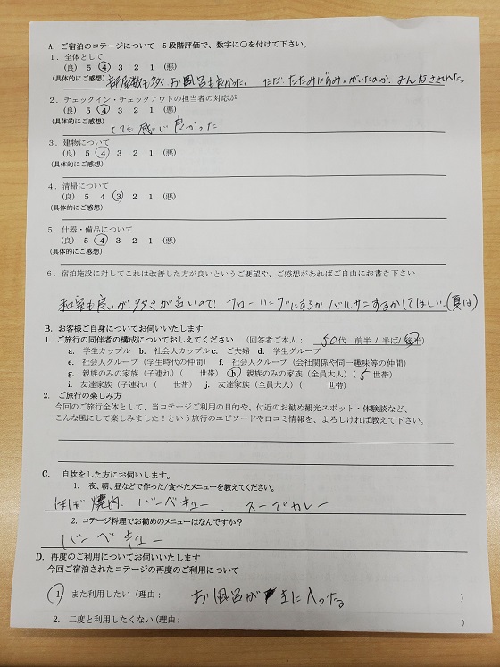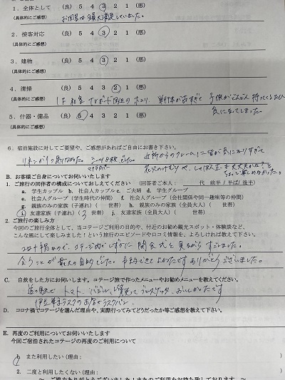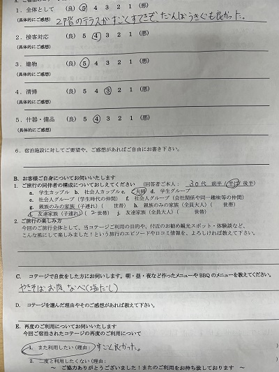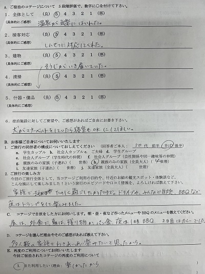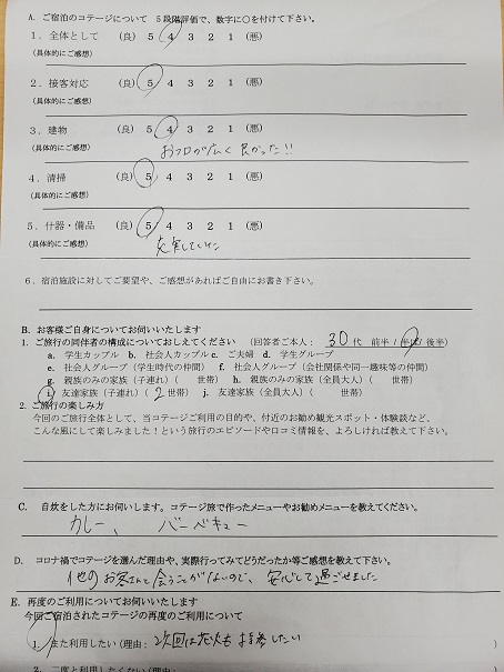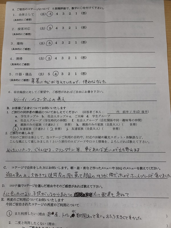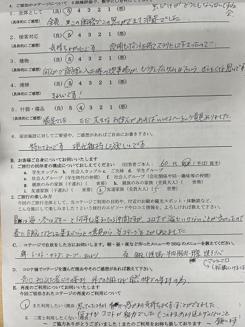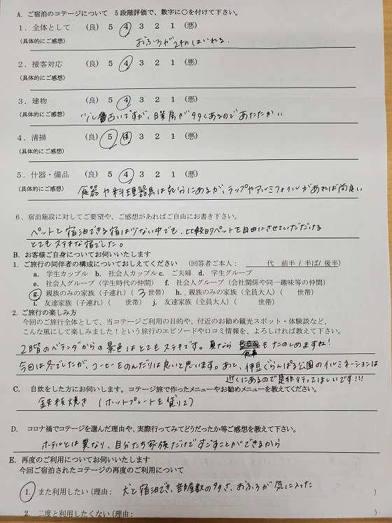 コロナ禍でコテージを選んだ理由は、他のお客さんと会うことがないので、安心して過ごせました。