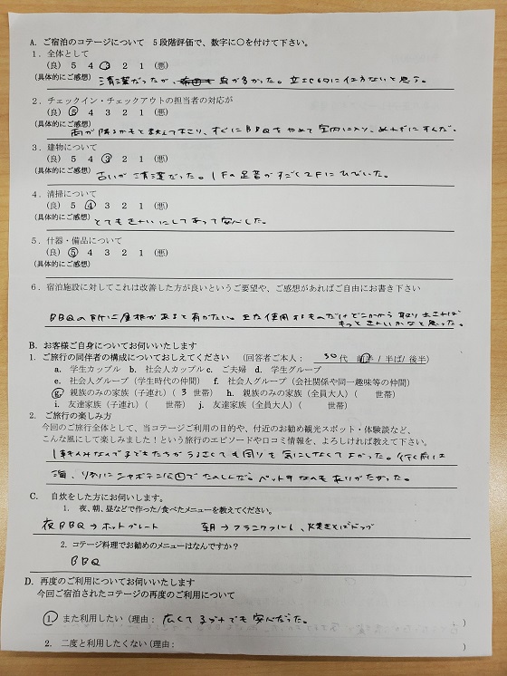 気心しれた者だけの集まり、外でのBBQなど自然の中での集まりの為コテージを選びました。