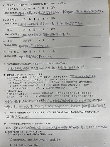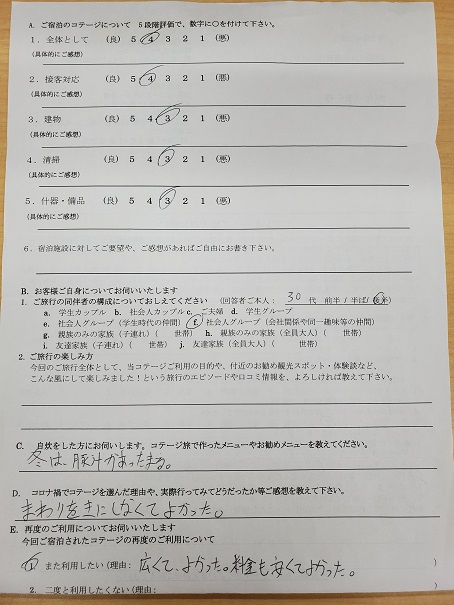 全体として:星5。学生時代の同期で利用したが、間取り、室内は広く、東京神奈川からのアクセス両行、価格も安価だったため。