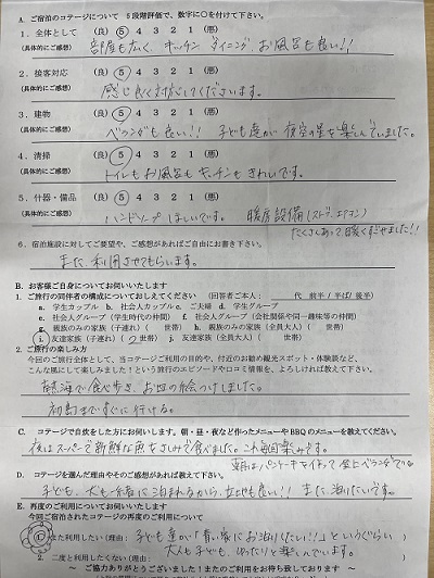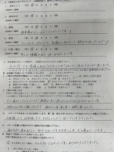 コテージを選んだ理由:海がちかく、車がおけて、多少さわいでも大丈夫な点、犬を連れていける点。