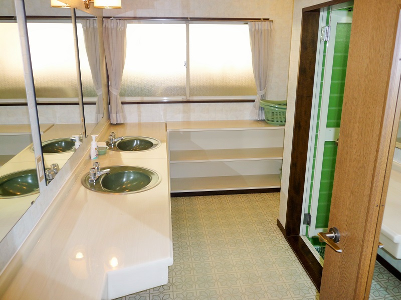 森の中のコテージらしく、グリーンで統一された洗面。10名でも悠々と使える広さ。