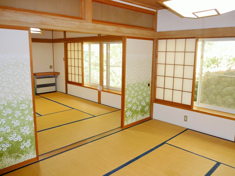 和室2。窓が大きいので、景色も良いです。周辺は森の景色。フレッシュな空気で換気も十分に行えます。