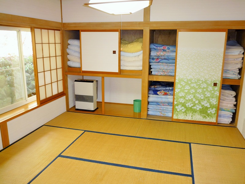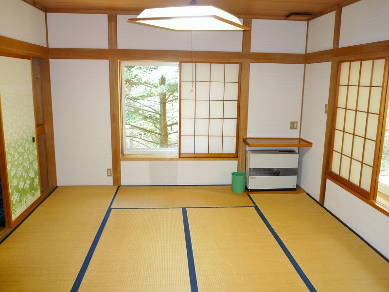 和室。窓を開けると、周囲の森に小鳥のさえずりが響き渡っているのが聞こえます。