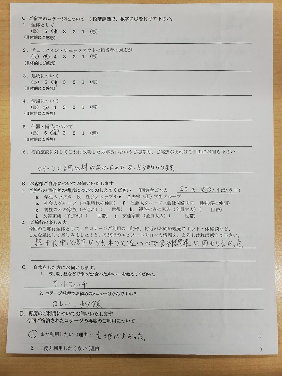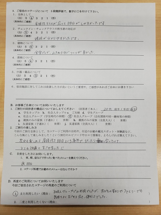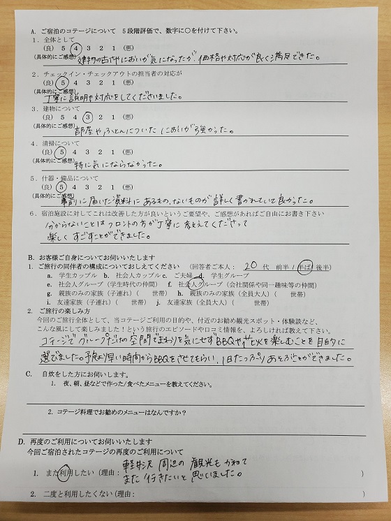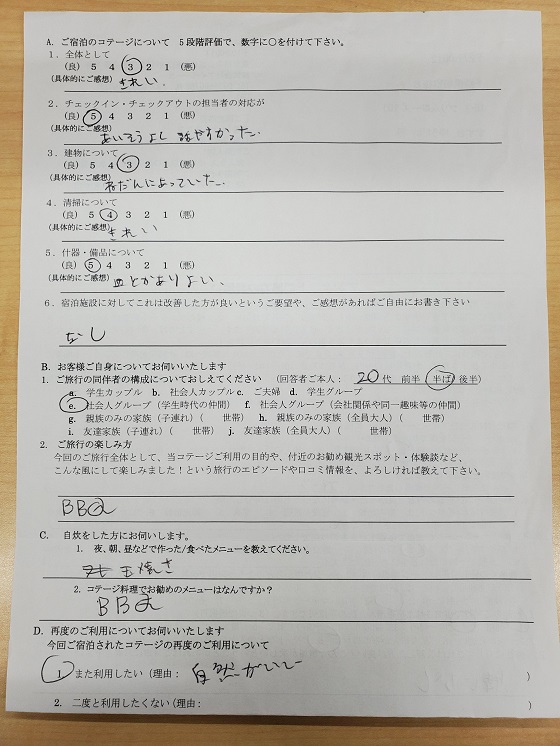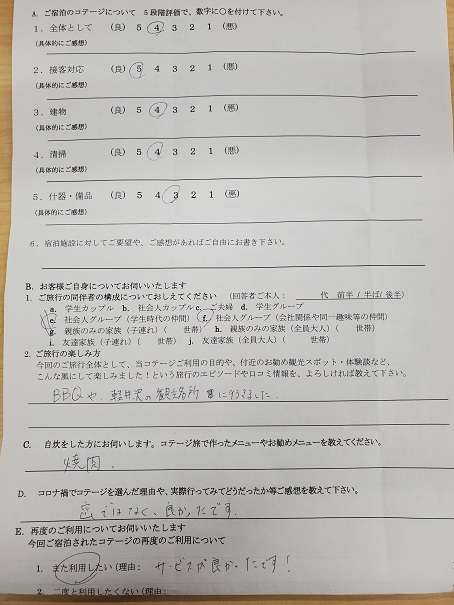 コテージでグループだけの空間でまわりを気にせずBBQや花火を楽しむこと目的に選びました。