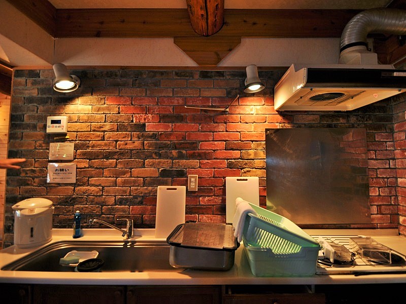 軽井沢143のログハウス内キッチンはレンガ風にスポットライトありのおしゃれな造り