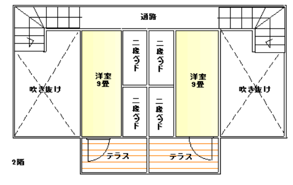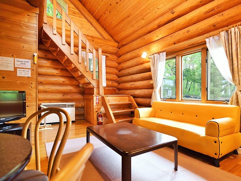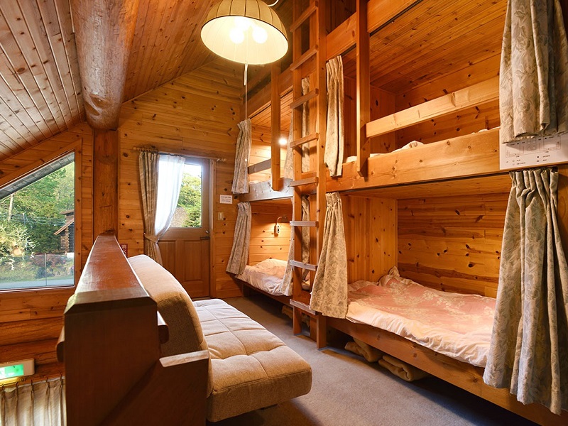 4名用が2棟連棟になっているログハウスです。2階の渡り廊下のみで繋がっているので、2カップルでのご利用や、世帯別に宿泊したいが近くに泊まりたいという方に最適。8名様が最大収容人数となりますが、8名ですと少し手狭になりますので予めご了承下さい。(7.8名など人数が多い場合は、12名用ログハウスの方がお勧めです。)