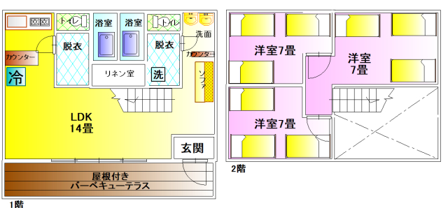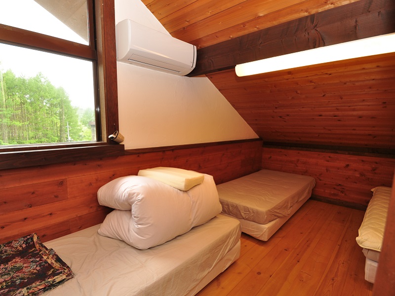 寝室は全員がベッドをご利用いただけます。浴室と洗面が2つづつ付いていますので、2世帯ファミリーや男女別グループなどに向いているコテージです。