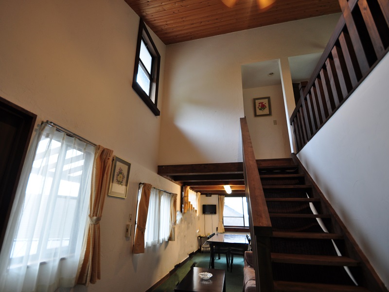 管理棟から一番近くに立地している、便のよいコテージです。2階建ての室内は高い天井の吹き抜け部分があり、リゾート感を味わえます。