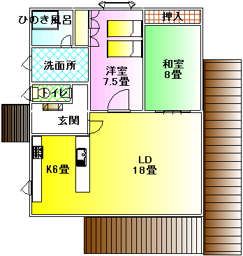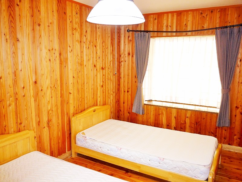 リビングダイニングは広々18畳、洋室にベッドが2台あり、その他の方は和室で布団をご利用いただきます。コテージ内にはひのき風呂も付いています。