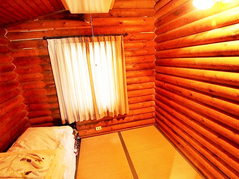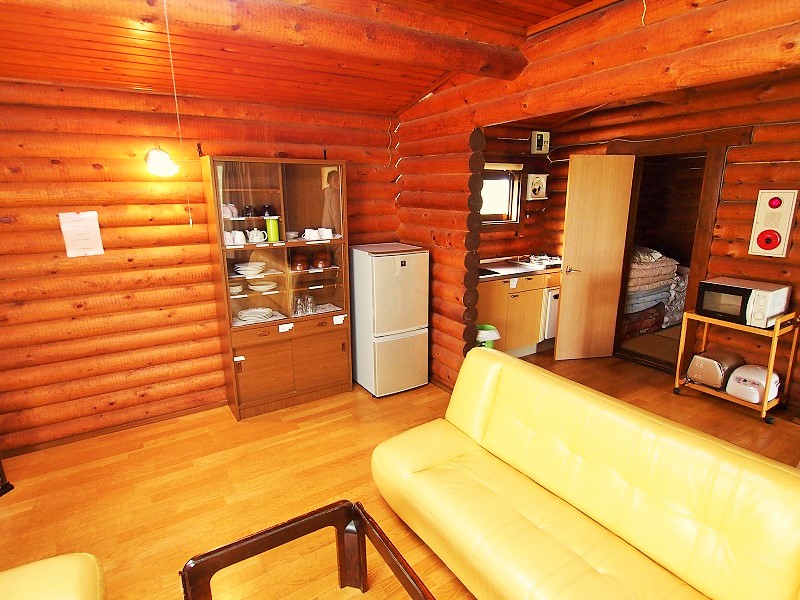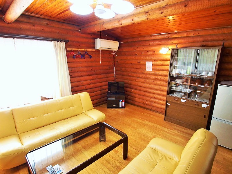 内装はコンパクトながらログハウスの雰囲気を味わえるリゾート空間。寝室は和室が1部屋なので4名の場合はソファーベッドを2台ご利用いただきます。