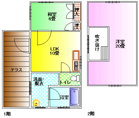 間取りは、1階リビング10畳、和室6畳、2階に洋室20畳の広々した空間がございます。(ロフト部分は階段ではなく、はしごで登っていきます。天井は低い為大人は立つことができません。)