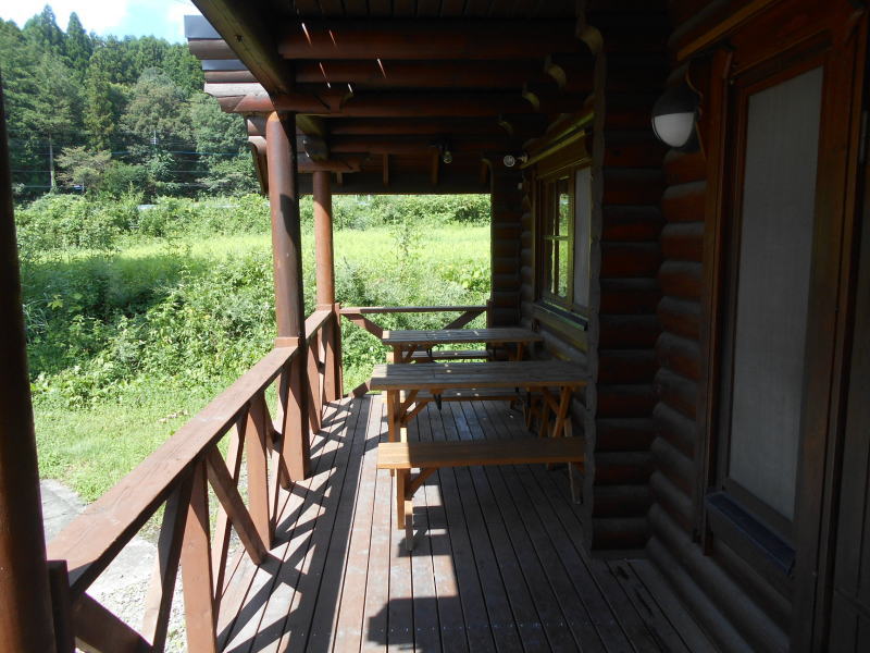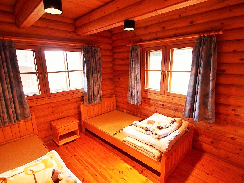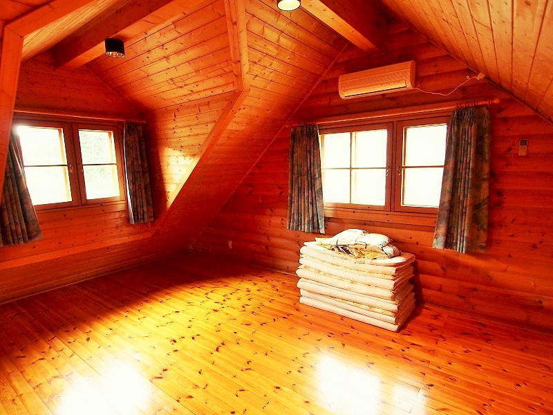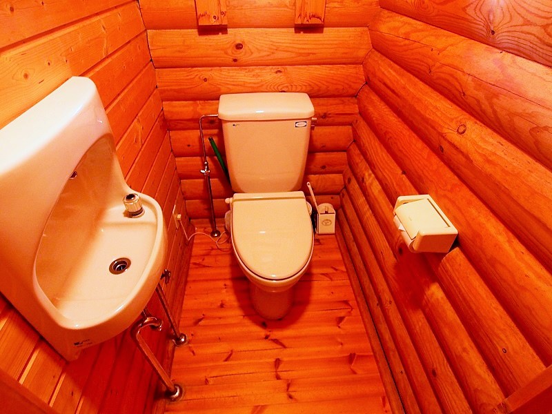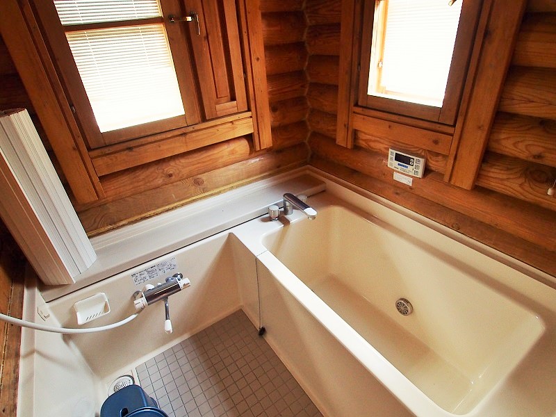 ログハウスは極太丸太の本格派。浴室は、蛇口を捻ると温泉が出てくるので、ちょっと贅沢をして、リゾートを満喫したいグループには最適です。
