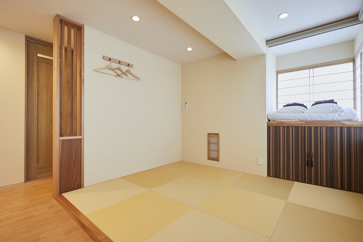 和室の畳はモダンな琉球畳。昼は広く、夜は布団を並べて就寝できます。
