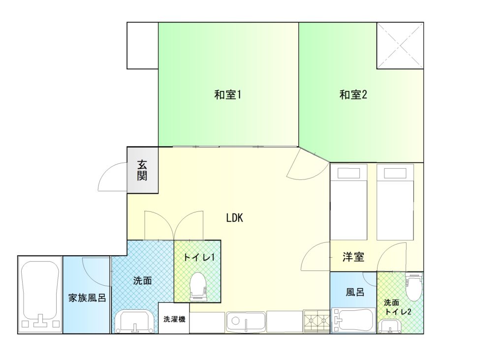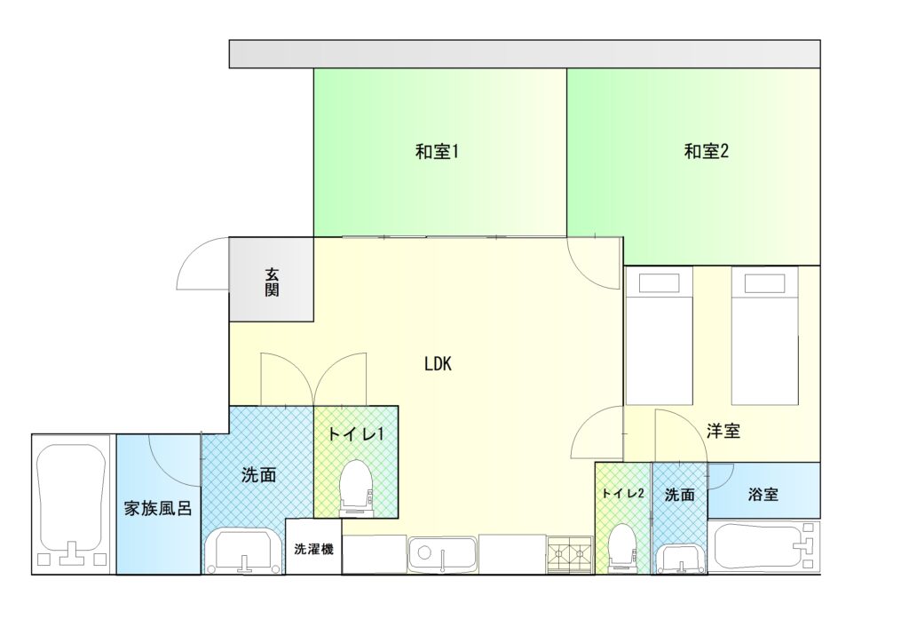 浴室は大型浴槽で、大人2名・子供1名で入っても余裕の広さ。数世帯ファミリーでの利用を想定した間取りの為、洗濯物干しなども部屋毎に用意されており、快適に連泊もできます。