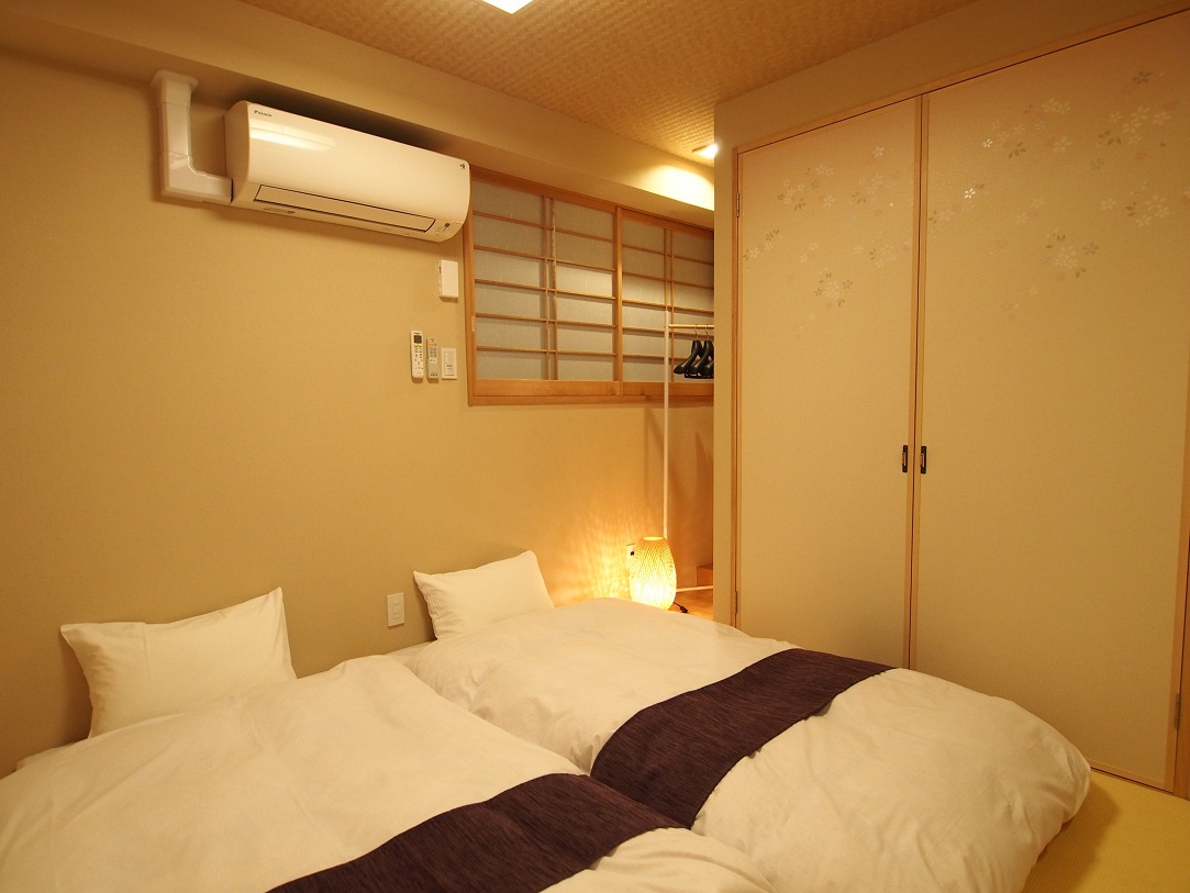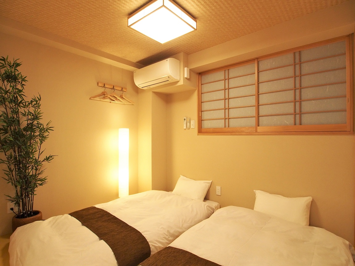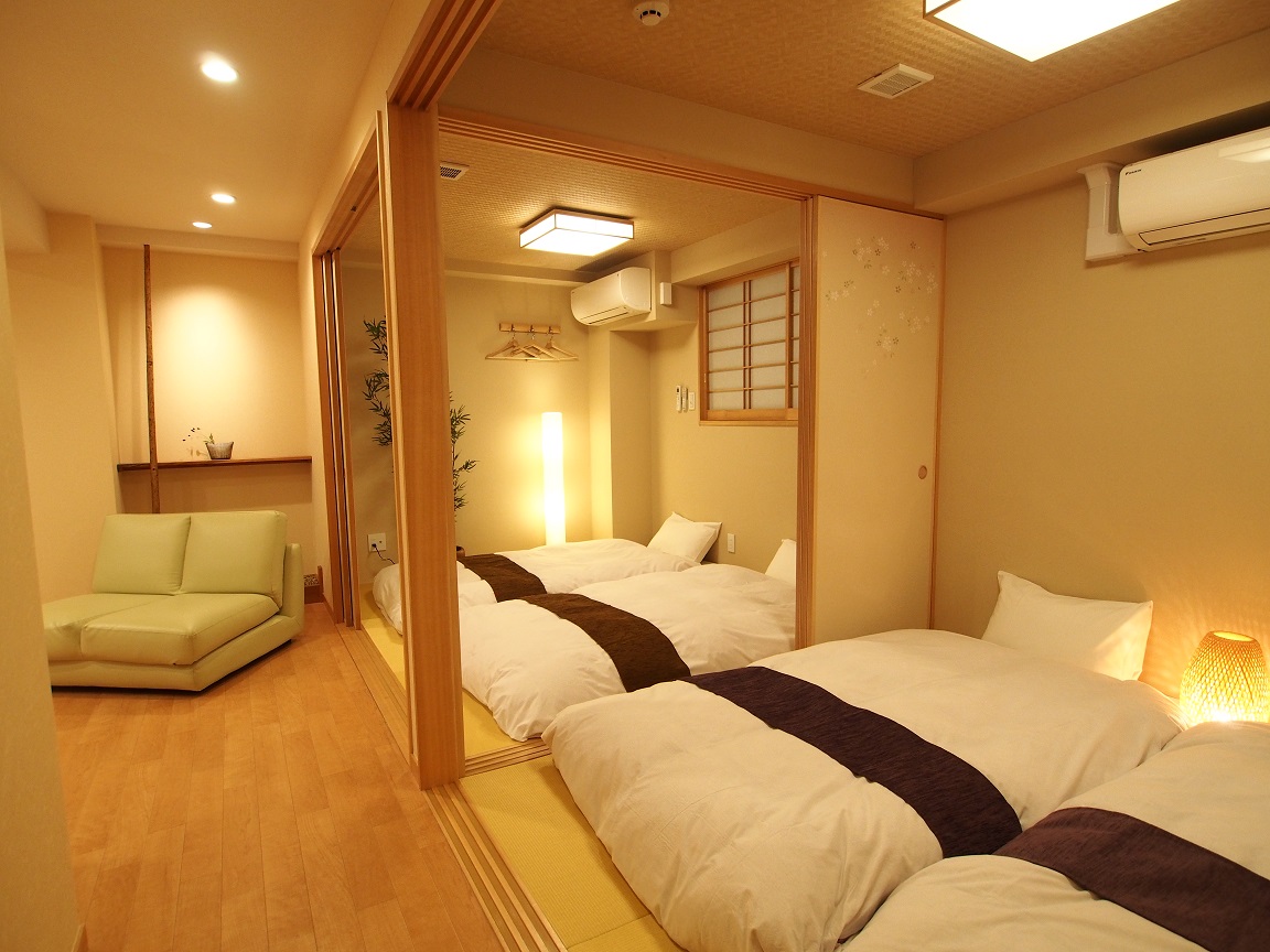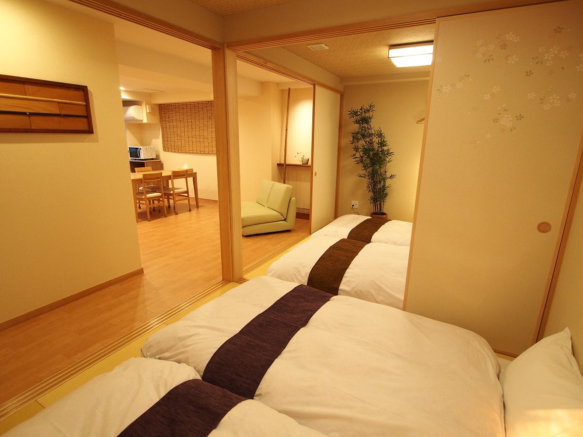 4名用室内は、沙羅の木の飾り棚に、欅の時計、黒竹の壁飾りのある、木のぬくもりあふれる落ち着く和の空間になっています。寝室の和室は襖で2間に仕切れるので、3世代旅行や友人家族でのご滞在など、世帯別の滞在にも適しています。お部屋は60平米の広さがあり、長期滞在にはこちらの客室が便利です。