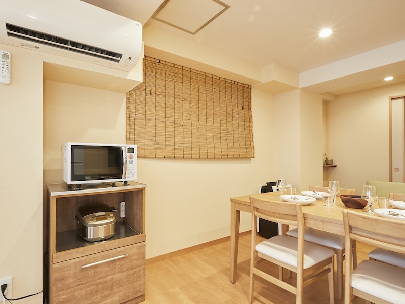 リビングスペースにはソファあり。ダイニングでは4名掛けのテーブルの他、希望者の方にはベビーハイチェアのレンタルなども無料で可能です。