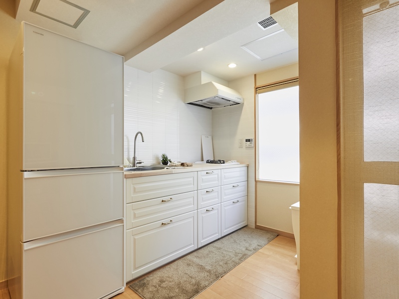 キッチンには大型冷蔵庫完備。長期滞在にも使えます。