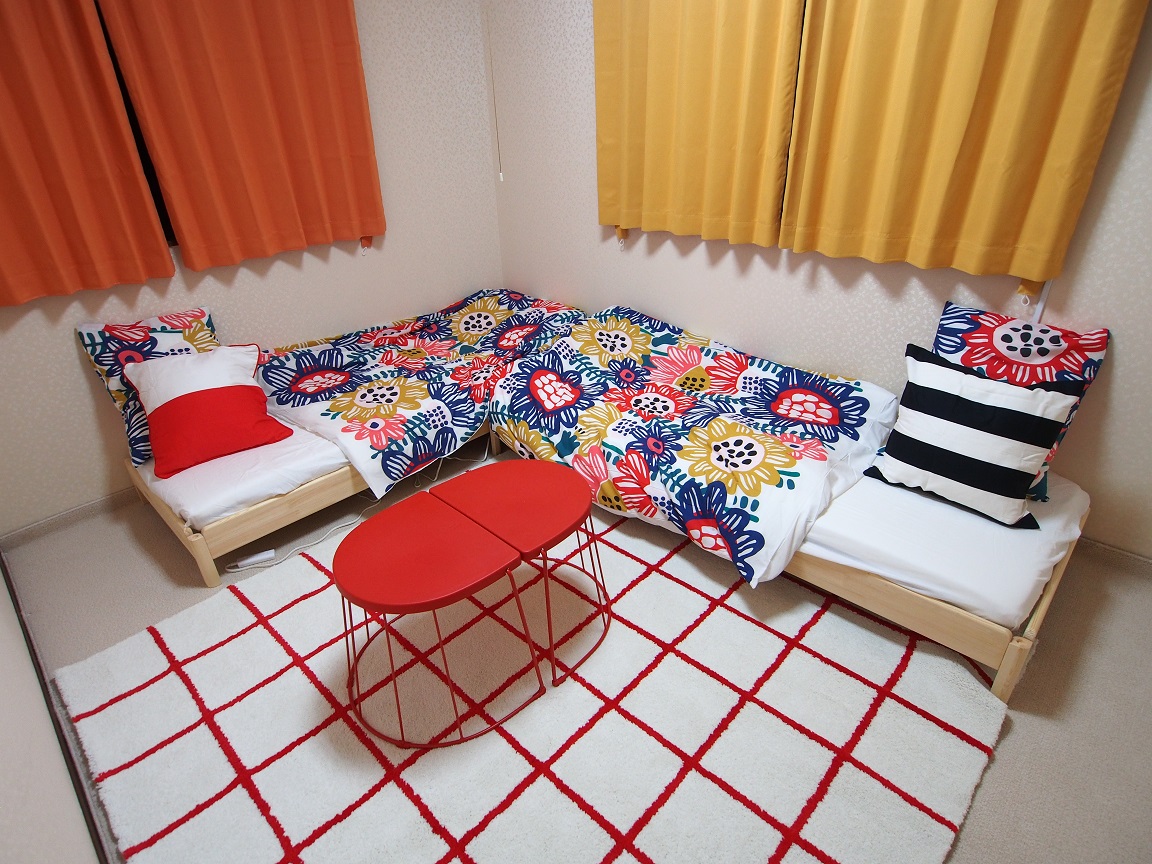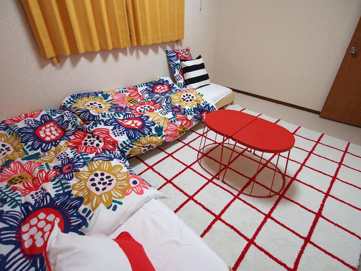 洋室にローベッドが2台のベッドルーム1。こちらは明るいレッドカラーで統一されたインテリア。女子会やグループ・団体でのご利用に人気です。