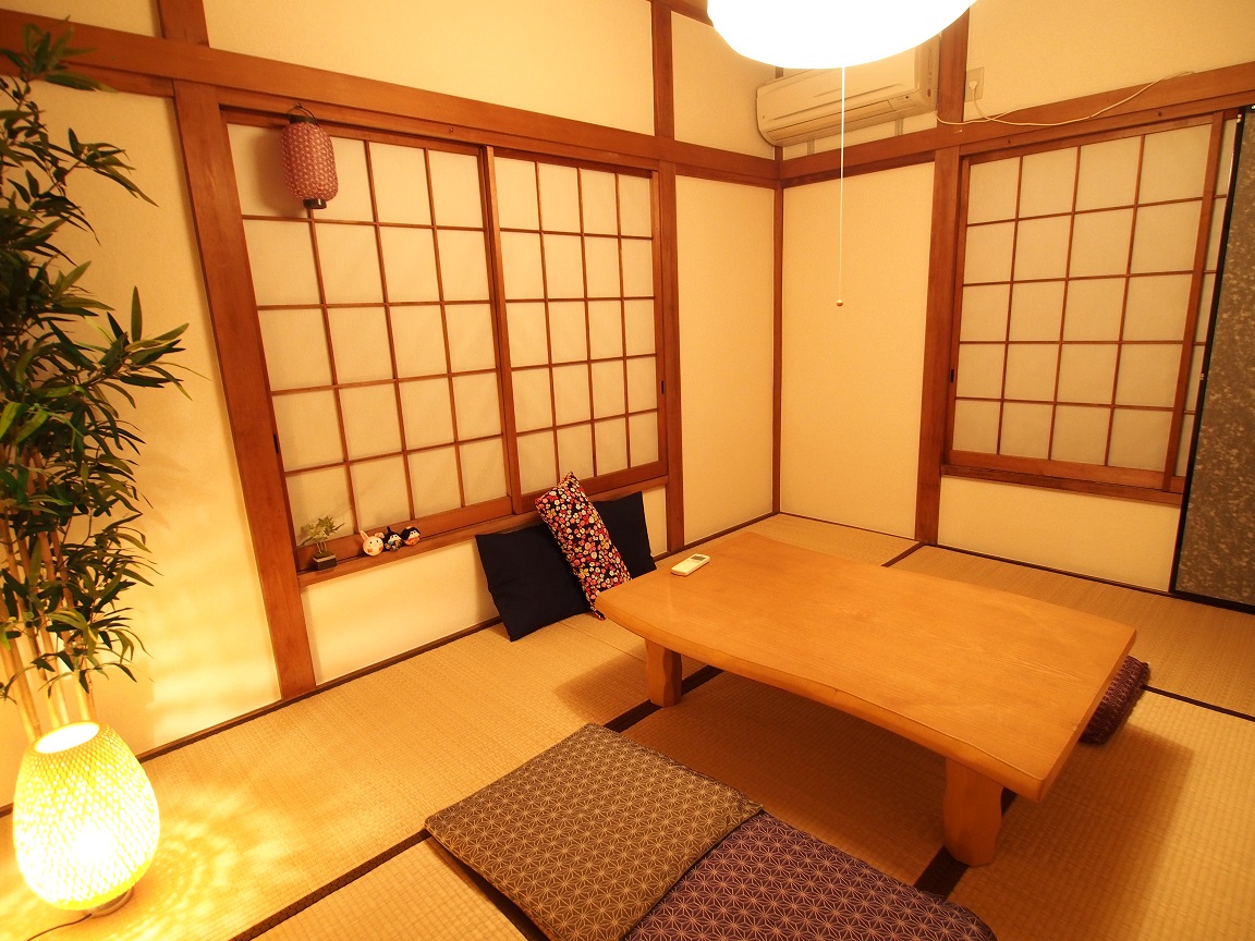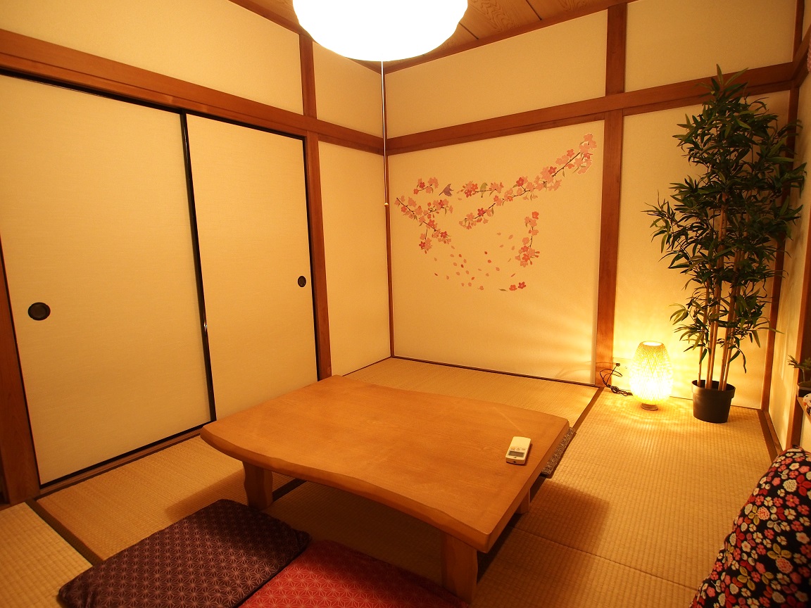 ベッドルーム3は純和室。障子と桜の壁装飾の組み合わせも楽しく、みんなでわいわいと過ごせる空間になっています。ベッドルーム3はお布団を最大3組敷けます。
