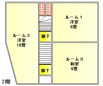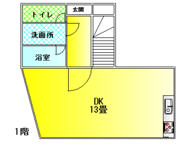 1階には、リビングダイニングスペースとキッチン、浴室トイレ洗面があり。2階部分には寝室が3か所。