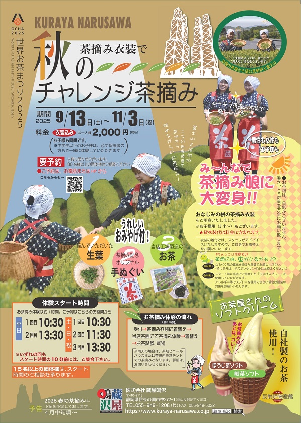 秋の過ごしやすい気候の中、茶摘み衣装に着替えて秋の茶摘み体験が楽しめます!
