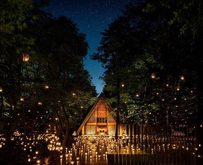 昼間の姿と違い、夜になると幻想的な空間に生まれ変わる高原教会。