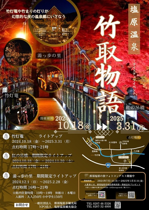 塩原温泉街では、2025年3月31までライトアップがお楽しみ頂けます。