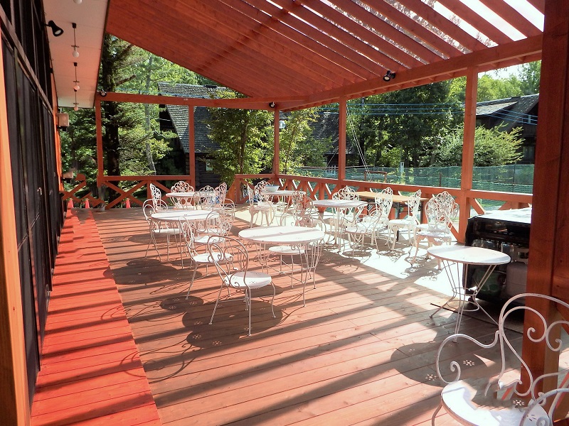 【ログスイートタイプ】15名用大型棟のテラスで、25名程度まで集まることが可能です。一部立食などでお楽しみいただく場合もございます。もちろん屋根付きスペースですので、大人数でのBBQ大会も可能。