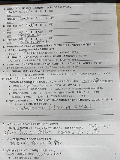 接客対応は、とても親切に対応して頂きました。 建物・客室は、広々としていてリラックス出来ました。 清掃は、とても綺麗にされていて、安心して利用出来ました。 什器・備品は、ベットの寝心地最高でした。 全体として、是非またご利用させて頂きたいです。 露天風呂がとても良かった。 バーベキューコーナーは、とても良かった。 また利用したい。